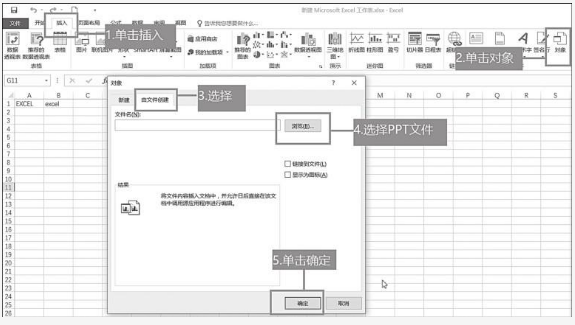 打开一个Excel2016文件,单击【插入】选项卡中【文件】选项组内的【对象】选项。在弹出的【对象】对话框中选择【由文件创建】选项卡,并单击【浏览】按钮,选择需要添加的PPT文件。