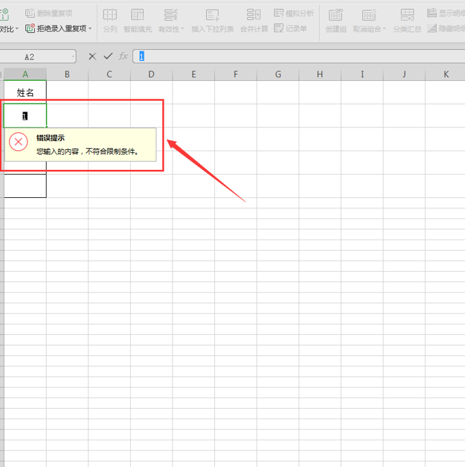 经过前几步操作,我们把单元格内输入的内容设置为限定长度2-5个数据的文本。我们返回Excel表格,输入数字会出现出错提示,输入正确的内容才不会出现提示: