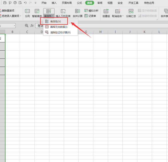 然后,我们切换到【数据】页面,选中【有效性】右边的倒三角符号: