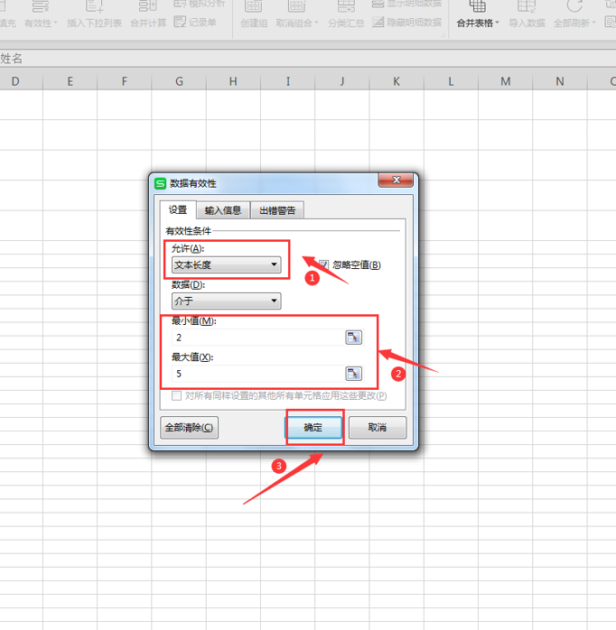 在弹出的数据有效性面板,把【有效性条件】设置为【文本长度】,【最小值】设为“2”,【最大值】设为“5”;最后按【确认】即可: