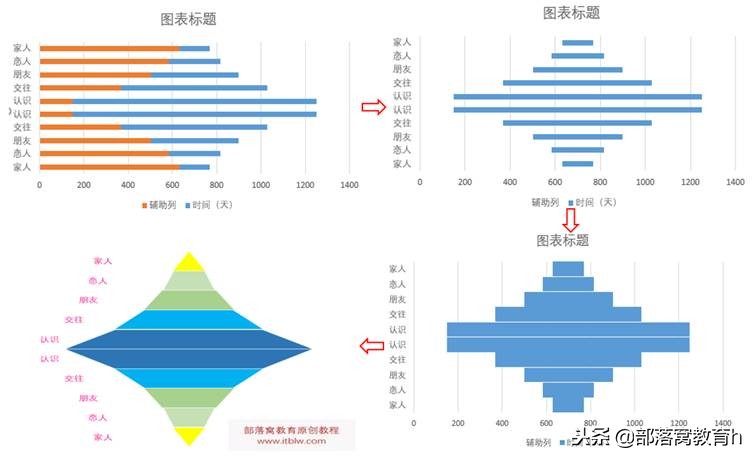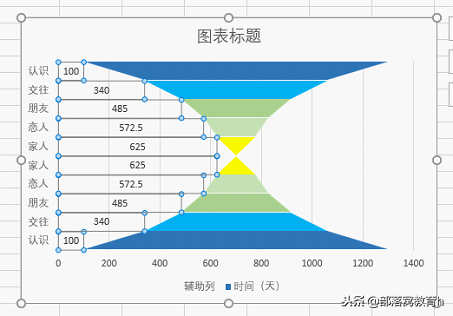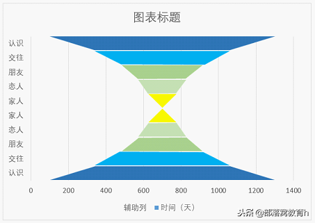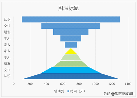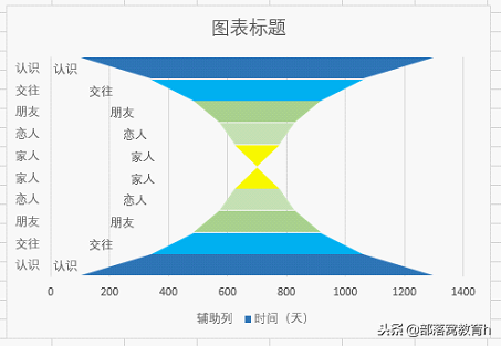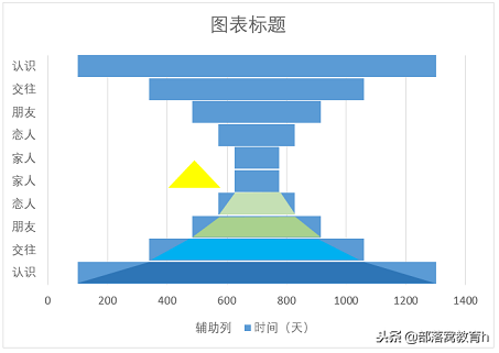 今天还是以两个人从相遇—交往—朋友—恋人—家人这样的过程为例来跟大家一起分享一下如何制作上图中的两个对称漏斗图。下表是各阶段对应的时间表格。