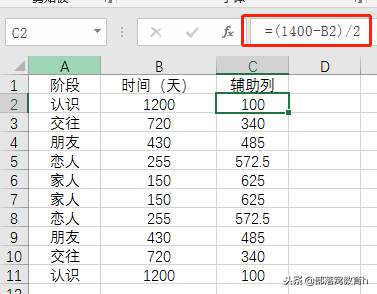 (1)首先还是在C列中插入辅助列,在C2单元格输入公式=(1400-B2)/2后向下填充建立辅助数据。