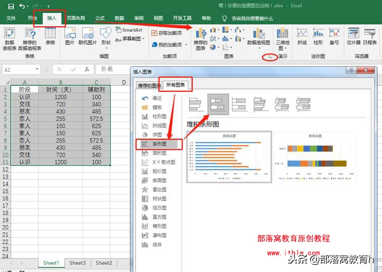 (2)选中表中数据单元格区域,单击【插入】选项卡【图表】功能组右下角【查看所有图表】小按钮,选择【条形图】中的【堆积条形图】。