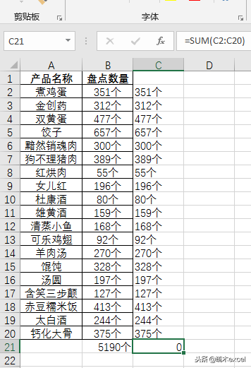这种填充结果看上去和ctrl+E填充的没有区别,实际两种方式填充后单元格的内容是完全不一样的。自定义单元格格式填充只是显示结果多后缀,但是实际单元格内容仍然是数值。选中单元格看编辑栏就可以看到,或者在盘点数量最后一个单元格按下alt+=会计算出正确的结果。而ctrl+E填充完了后是数值和文本的混合,是不能求和的。例如下图中对B、C两列做同样的求和方式,结果完全不同。