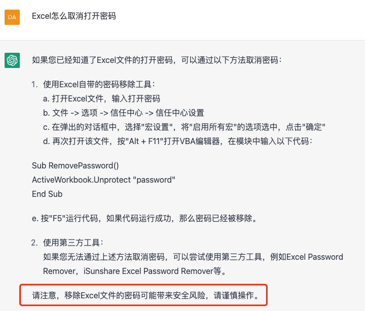 - 再来一个我们经常遇到Excel密码的问题,如怎么取消Excel的密码,不经常用会经常忘了在哪里,下面我们来看看ChatGPT给出的答案
