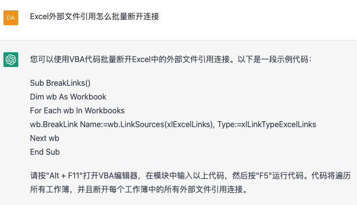 - 有时候我们Excel需要批量断开文件里面的引用,如果很多手动操作的话会特别繁琐,这个时候VBA就可以快速处理,我们让ChatGPT来帮我们写一下VBA的操作代码
