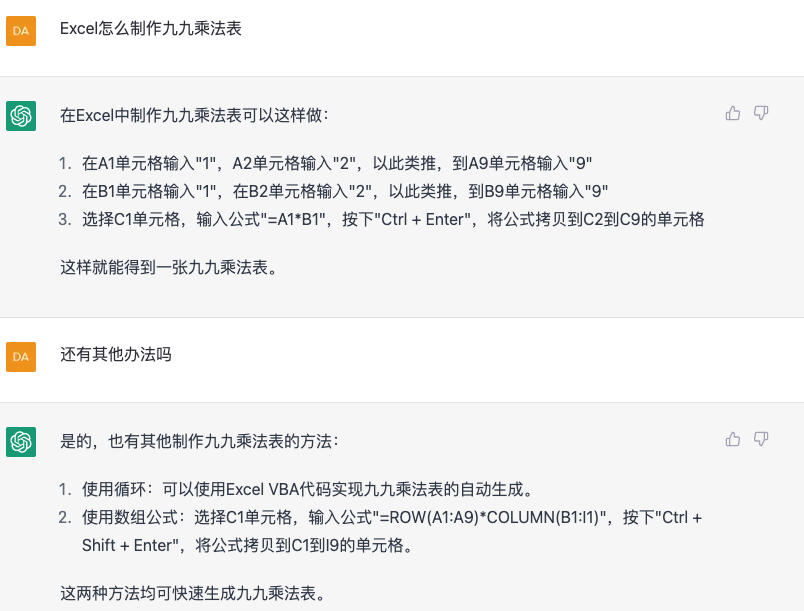 - 比如我现在需要用Excel制作一个九九乘法表,但是我不会,我就问一下ChatGPT。