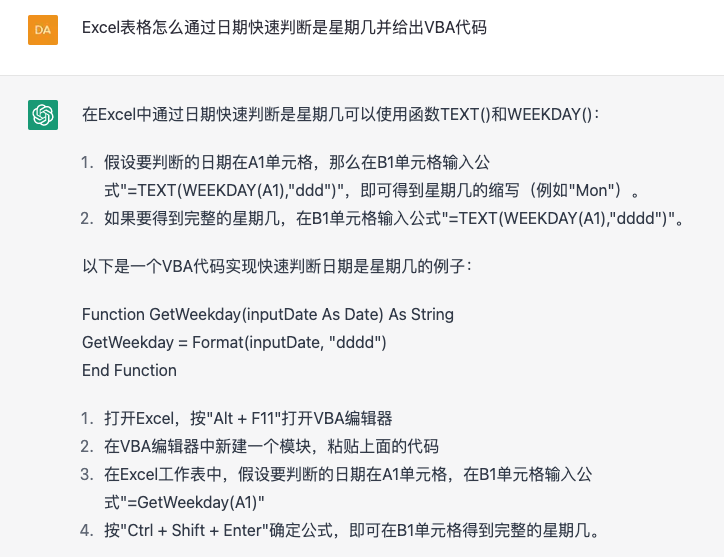 - 下面我们再来演示一个Excel常见的问题“在Excel表格怎么通过日期快速判断是星期几”,那我们只需要快速的把这个问题丢给ChatGPT,他会给出我们不用动脑的范例,包括了使用函数怎么做,使用VBA代码怎么做。这对于像我这种只知道Excel皮毛的人好用真不是一点半点。