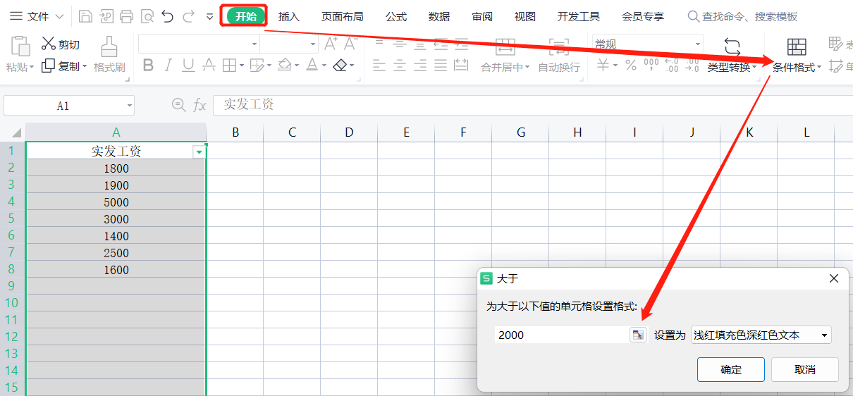 还是先选中这列数据,在开始-条件格式中,选择 突出显示单元格规则,在筛选条件填写>2000,设置为 浅色填充色深红色文本,然后点击确定。