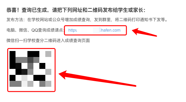 点击提交后,就会生成查询,我们可以将登陆易查分后首页上的二维码或者查询链接发给家长,也可以放到学校网站、公众号上。