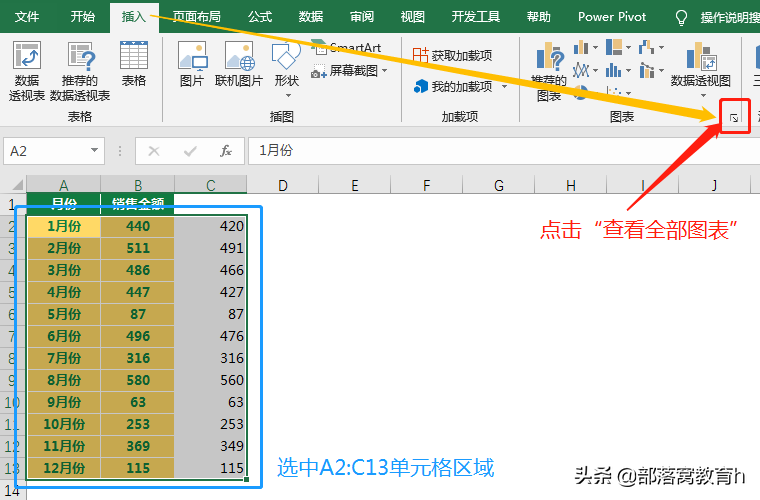 步骤2:选中单元格区域A2:C13后,点选工具栏——插入——图表项目组的“查看所有图表”。