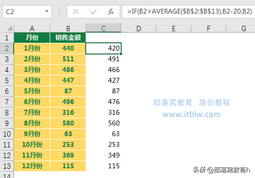 =IF(B2>AVERAGE($B$2:$B$13),B2-20,B2)