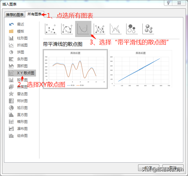 在“插入图表”窗口,选择“所有图表”,点击“XY散点图”,选择“带平滑线的散点图”。
