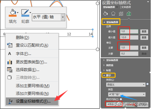 选中横坐标轴刻度,单击鼠标右键,在弹出的菜单中选择“设置坐标轴格式”,然后按下图的参数调整“坐标轴的边界”值为1~12,“主要单位”为1,在“数字”项中输入格式代码“#月份”,点击“添加”。