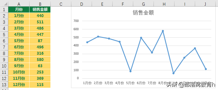 函数解析:如果“销售金额”大于平均数时,返回“销售金额”减去20,否则返回原本的“销售金额”,这里的20是为了,让折线图中大于平均线的部分是双线效果,低于平均线的是单线效果,这样能够有一个视觉上的延伸,让整体的图表线性看上去不是一样的宽度,有一种厚重感,吸引观阅者的视线,一眼看出业绩突出的部分。