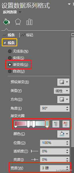 步骤4:下面我们来处理曲线的效果,在绘图区域中选中系列1,按下面的参数设置数据系列格式,RGB颜色分别是:181,73,91;150,190,189。