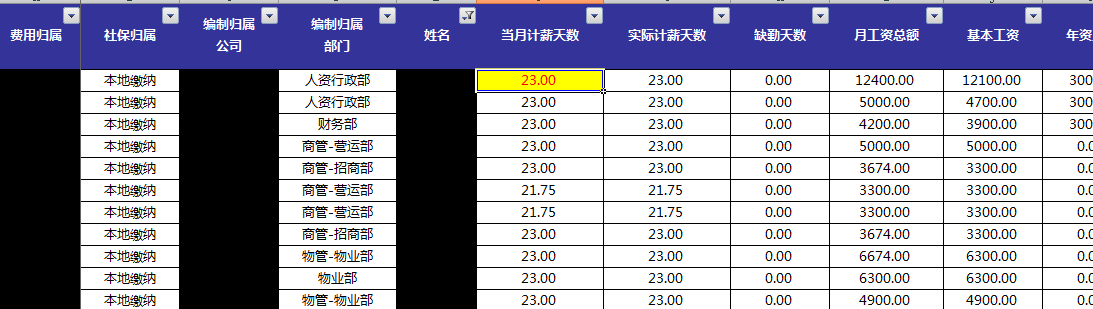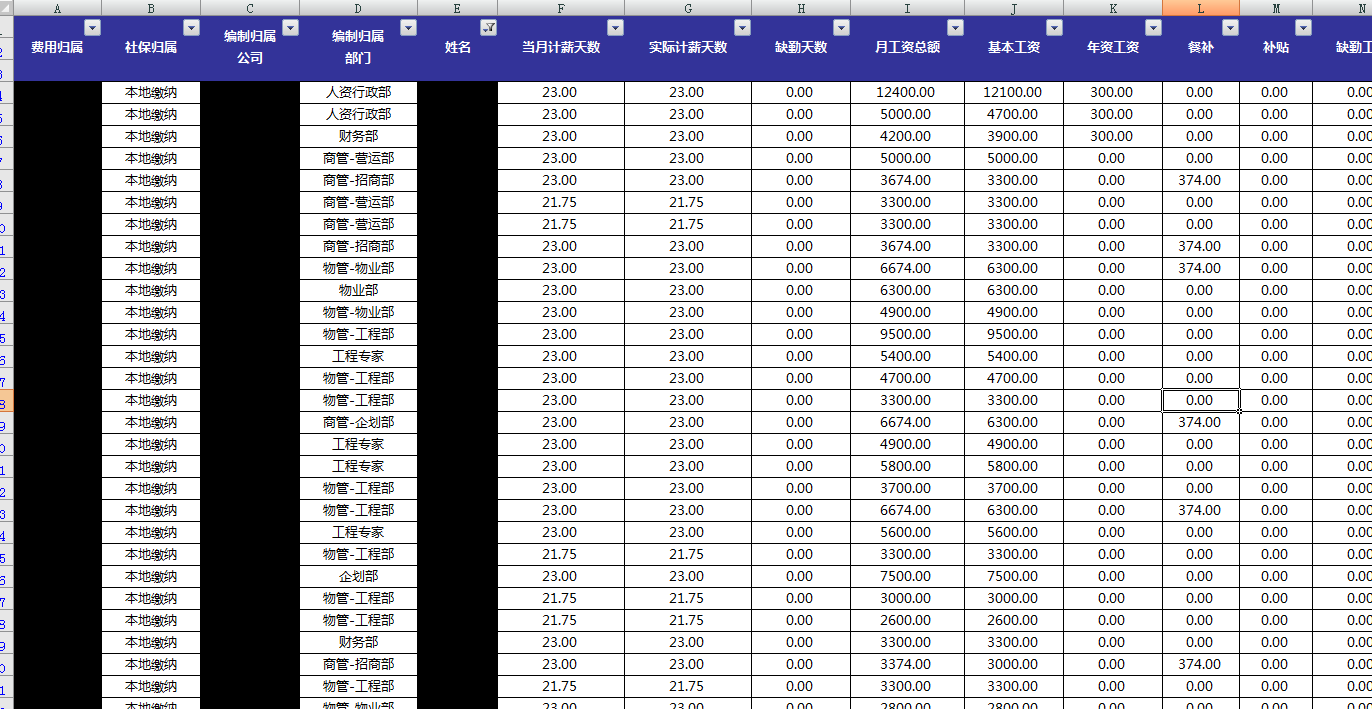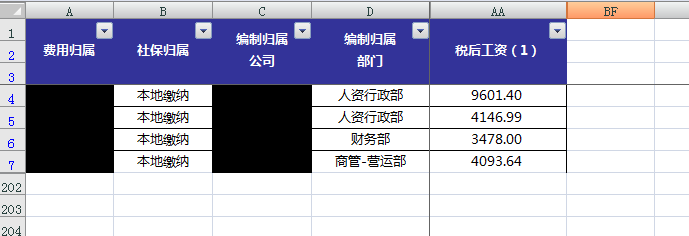 这是一张工资表,我已经把它缩到足够小,可以看到,数据密密麻麻看着就头大。而且还没有显示所有的行。