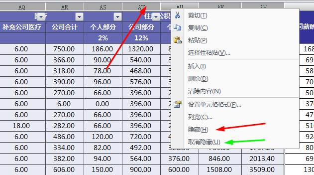 首先我们选择想要隐藏的行/列,然后右键点击标识行号或者列号的位置,如上图中最上面的箭头处,在弹出的菜单点隐藏即可。同样的,如果不需要隐藏了,点击绿色箭头标识的“取消隐藏”即可,或者把鼠标放在列标识的中间位置,当数遍变成两边箭头时,双击也可以取消隐藏单元格,如图,