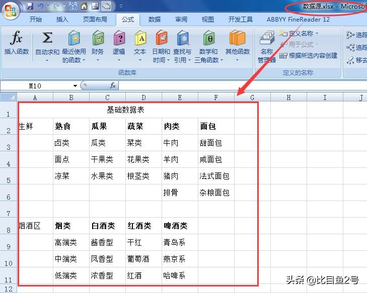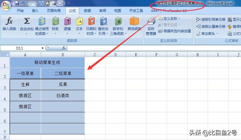 下图数据源文件“数据源.xlsx”里有基础数据,要在另外一个文件“跨文件设置联动下拉菜单.xlsm”里设置下拉菜单,使用“数据源.xlsx”文件里的数据作为菜单下拉选项。