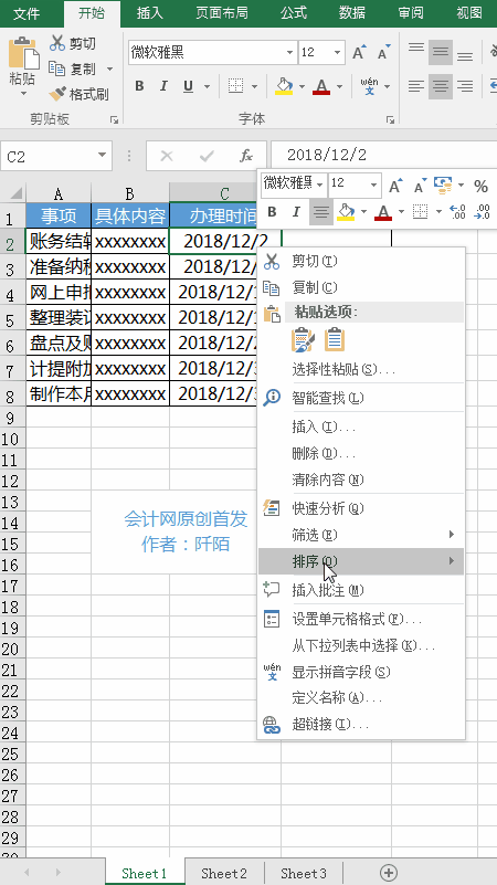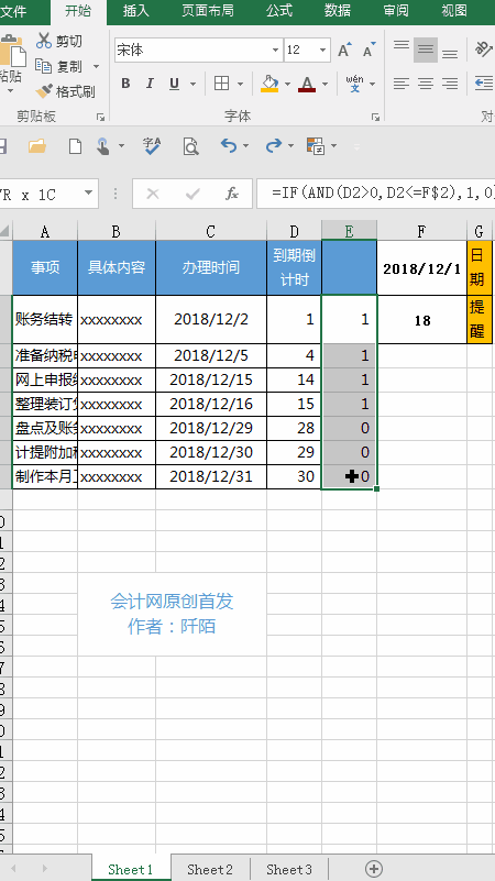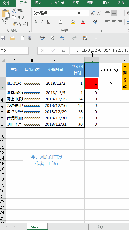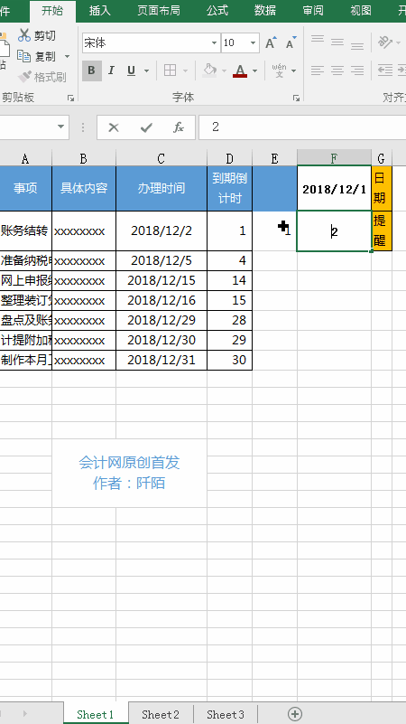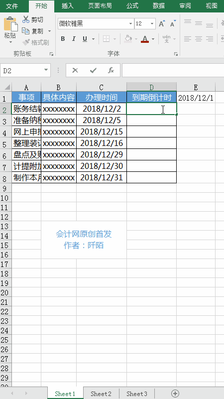 上面大致列了一些会计人一个月的待办事项、具体的内容、办理的时间和到期倒计时天数(以上内容仅用作演示,和实际会有差异)。假设今天是2018年12月1日,接下来阡陌会进行下列的操作。