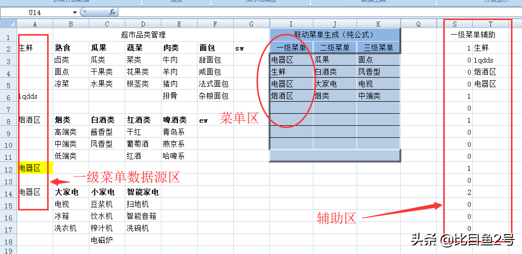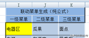 第一种公式法设置的菜单中,在已经选择了3级菜单的情况下,修改2级菜单和1级菜单,会得到了下图中“电器区”和“瓜果”及“面点”不是联动匹配的情况。
