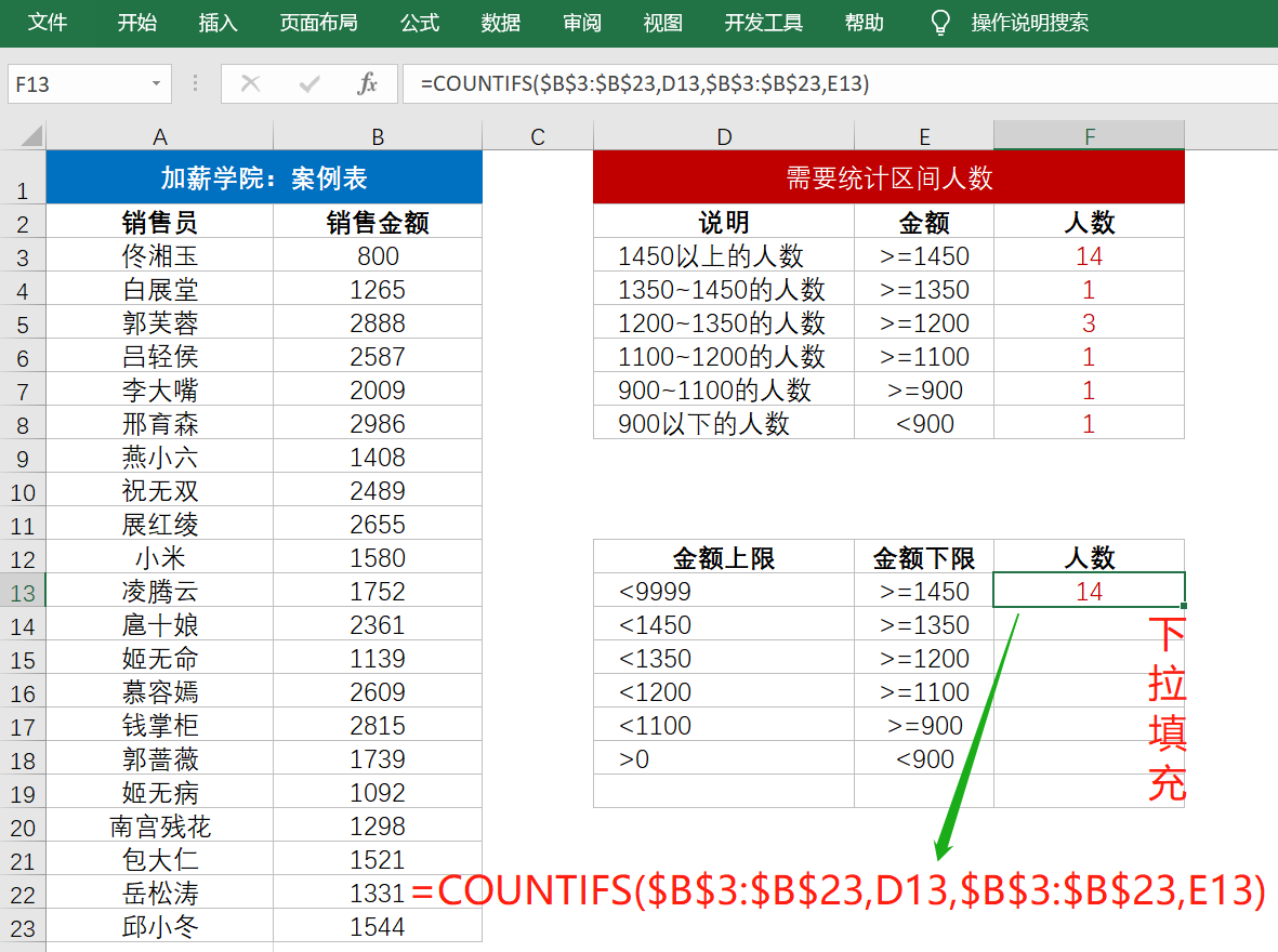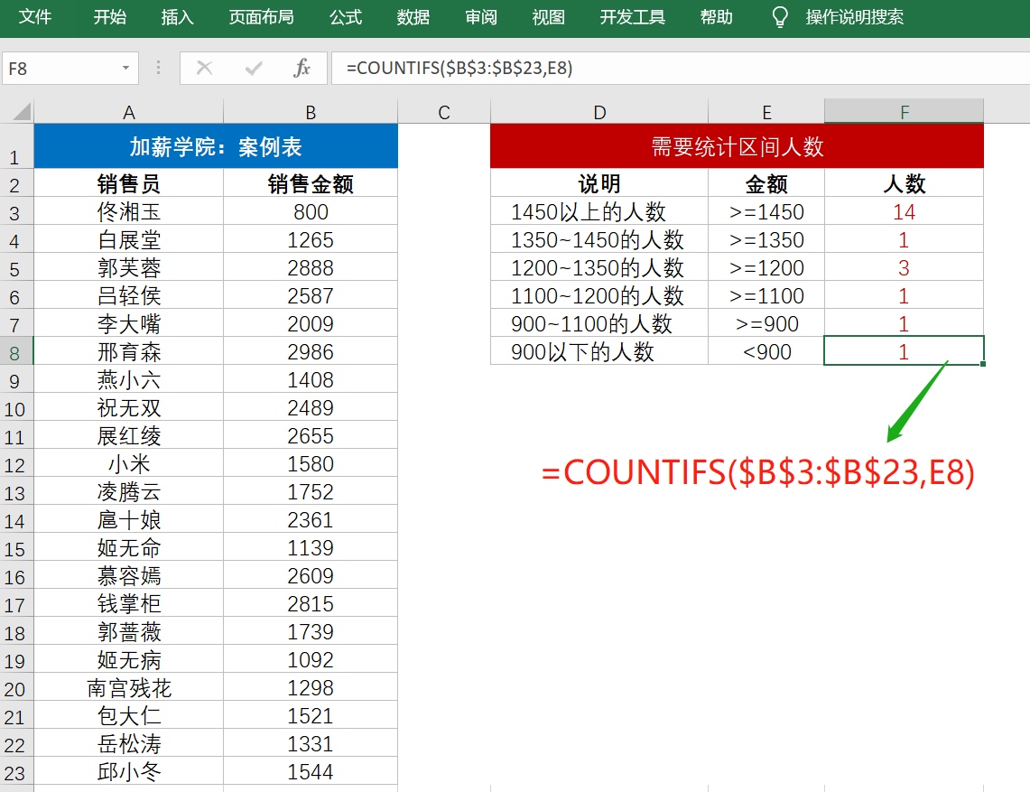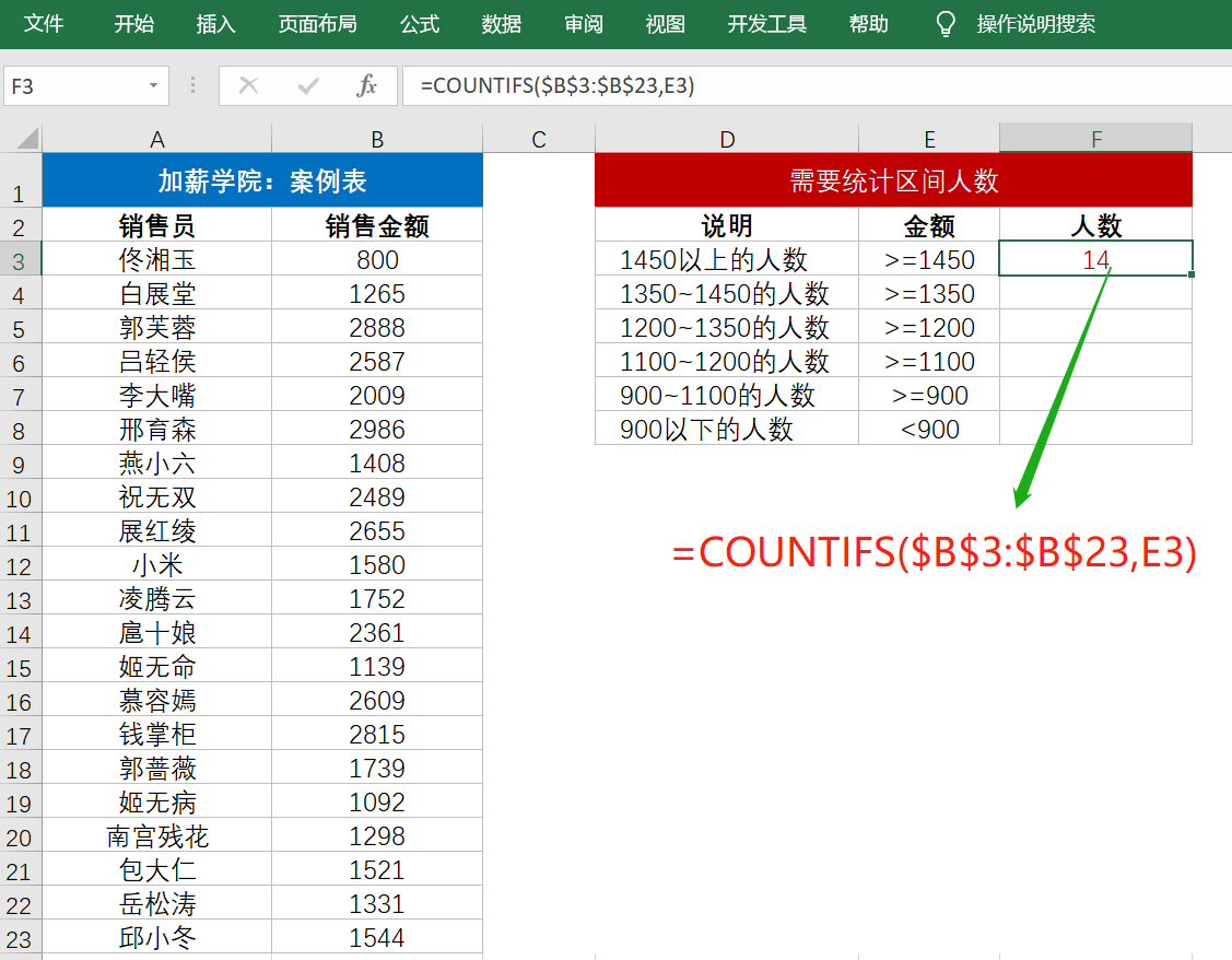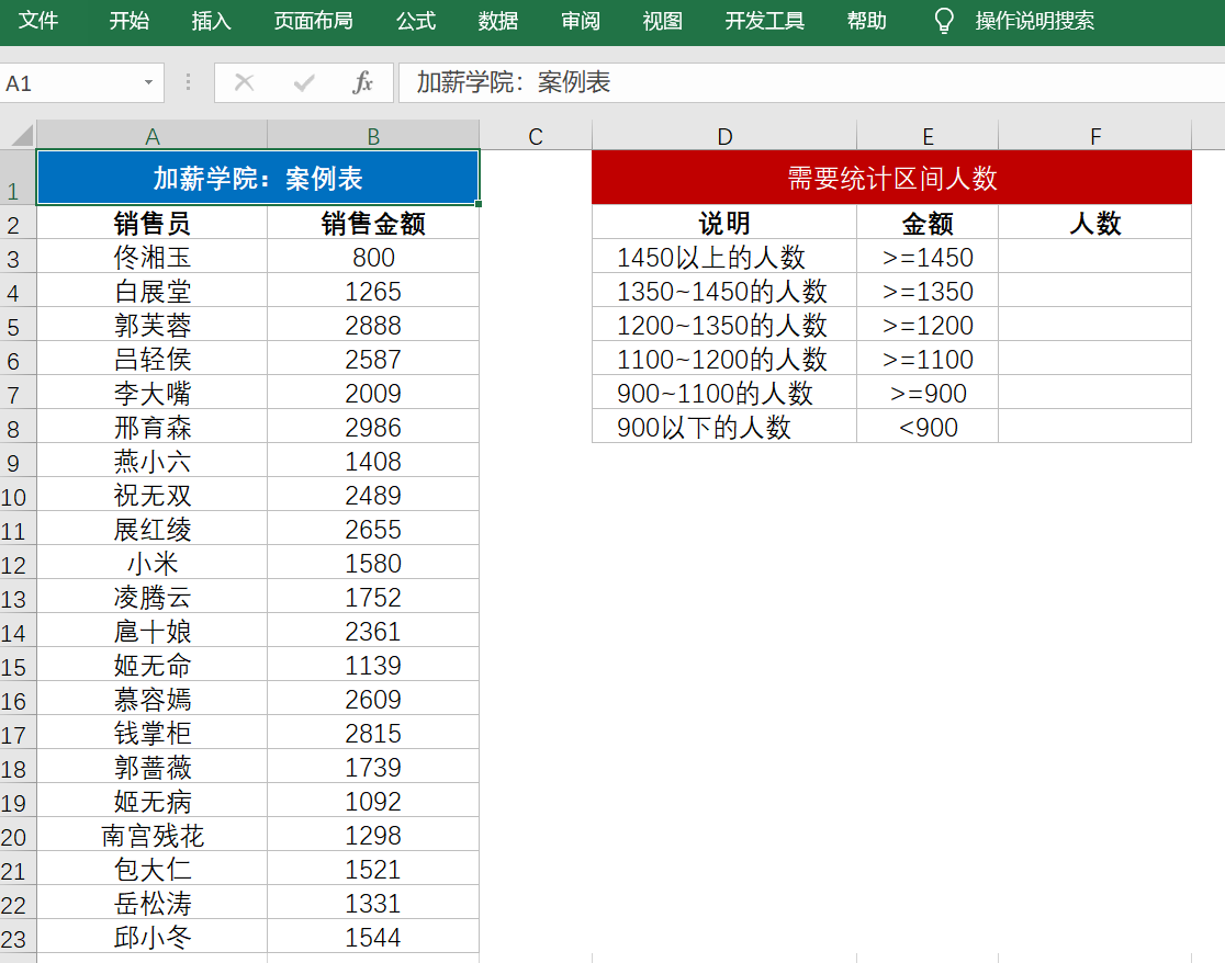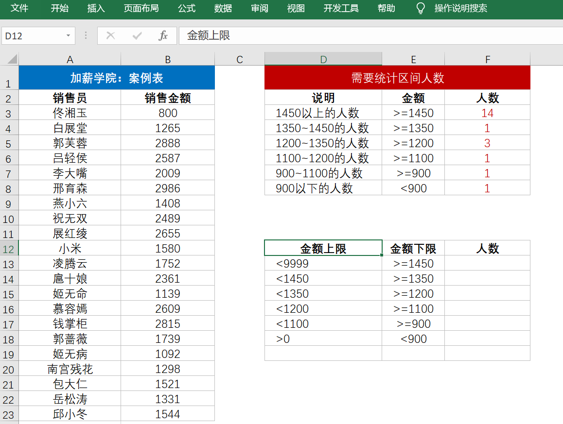 在图中案例表,已知销售员及其销售金额,现在需要根据销售金额的区间统计人数。这里,条件统计要用countifs函数,解决办法我们讲2个思路: