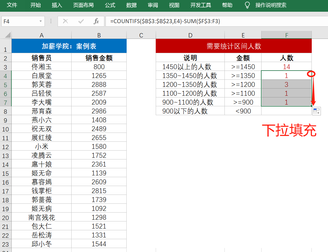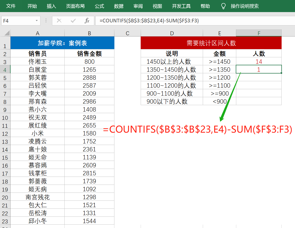 与F3单元格公式相比,这里多了“减去SUM($F$3:F3)”的部份。这是因为COUNTIFS($B$3:$B$23,E4)是获得B列>=1350的人数,这里是包含了>=1450的人数,所以要减去F3单元格里的数量。