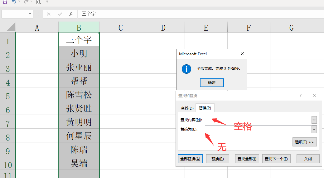 メ因为有空格符的存在,我们按下CTRL+H(替换),查找内容输入“ ”一个空格,替换为不管,点击全部替换。メ