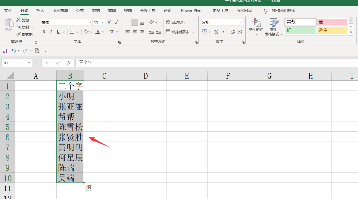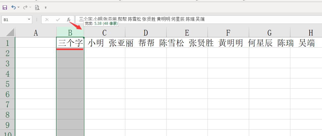 メ再拖动单元格列宽,列宽刚好挤下三个字的宽度为宜。メ