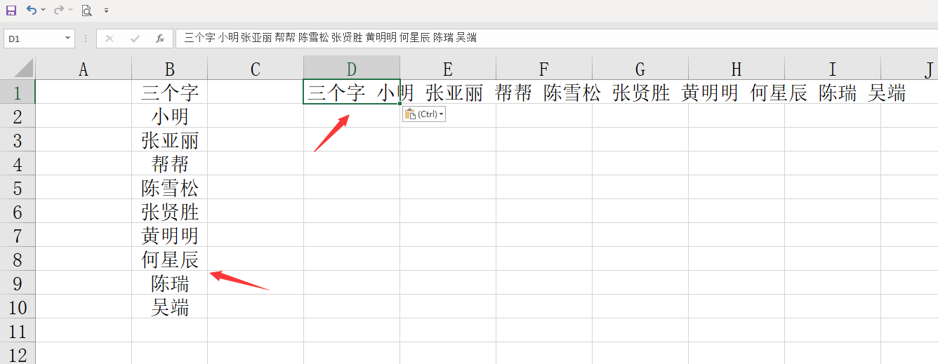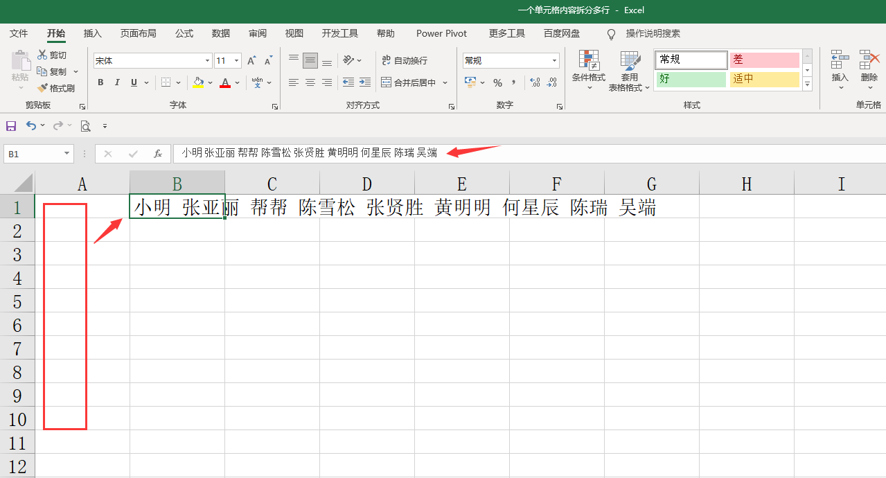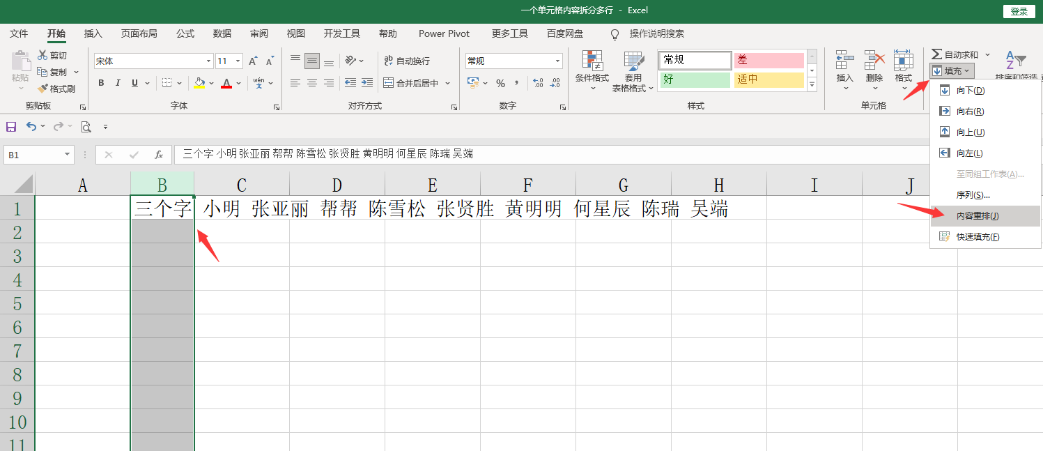 メ单元格内的姓名重新排版,每人一个单元格,占位整行。メ