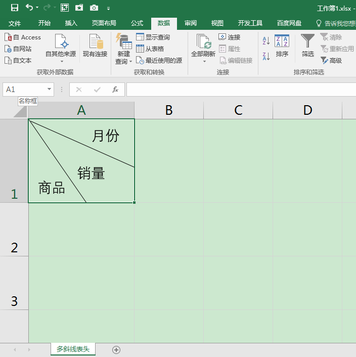 制作下图A1单元格中所示的多斜线表头,表头项目分别为"月份""销量""商品"。