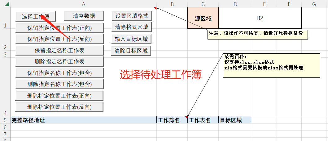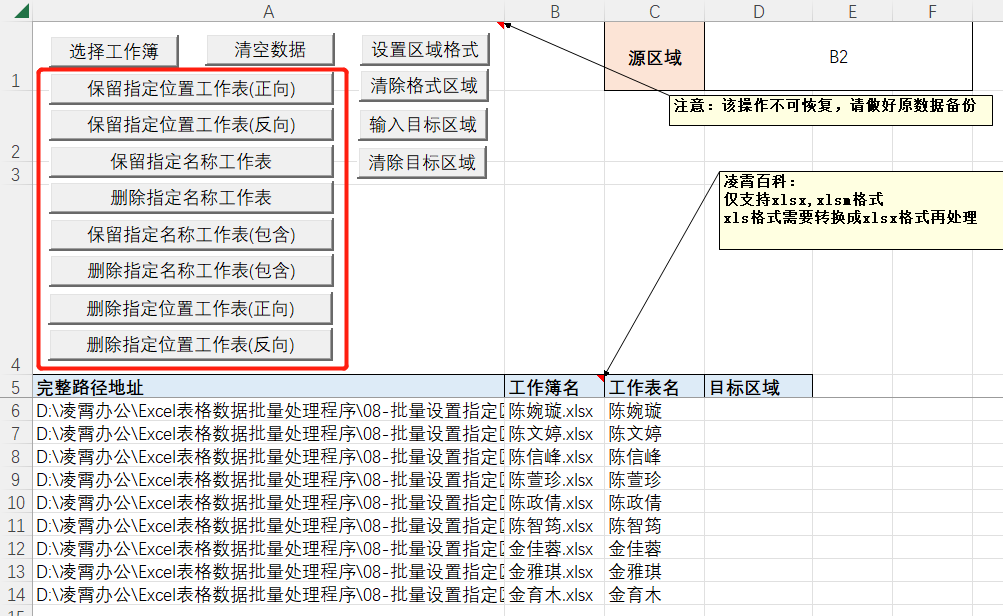可以通过上方的按钮筛选出待处理的工作表,不需要处理的工作表删除所在行,例如可以实现保留第一个工作表,保留指定名称工作表,删除第n个工作表,删除指定名称工作表等。