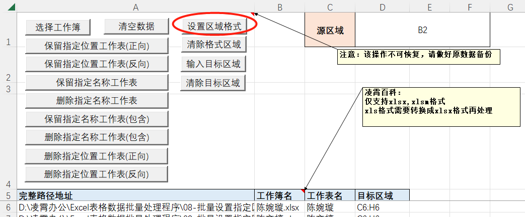 对于单个工作表,或几个工作表间这样操作比较方便,但是如果有几百几千个表格都需要设置格式,用格式刷每个表格打开,选择,设置就会很麻烦,需要耗费大量的时间和精力。因此要快速实现多个工作表指定单元格区域格式刷功能,可以使用Excel表格批量处理程序【08-批量设置指定区域格式(格式刷)】。