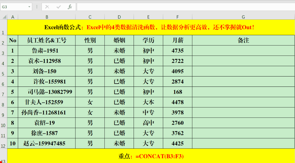 合并的内容中并没有“月薪”是因为其功能决定的,Phonetic函数不能合并没有拼音的字符。
