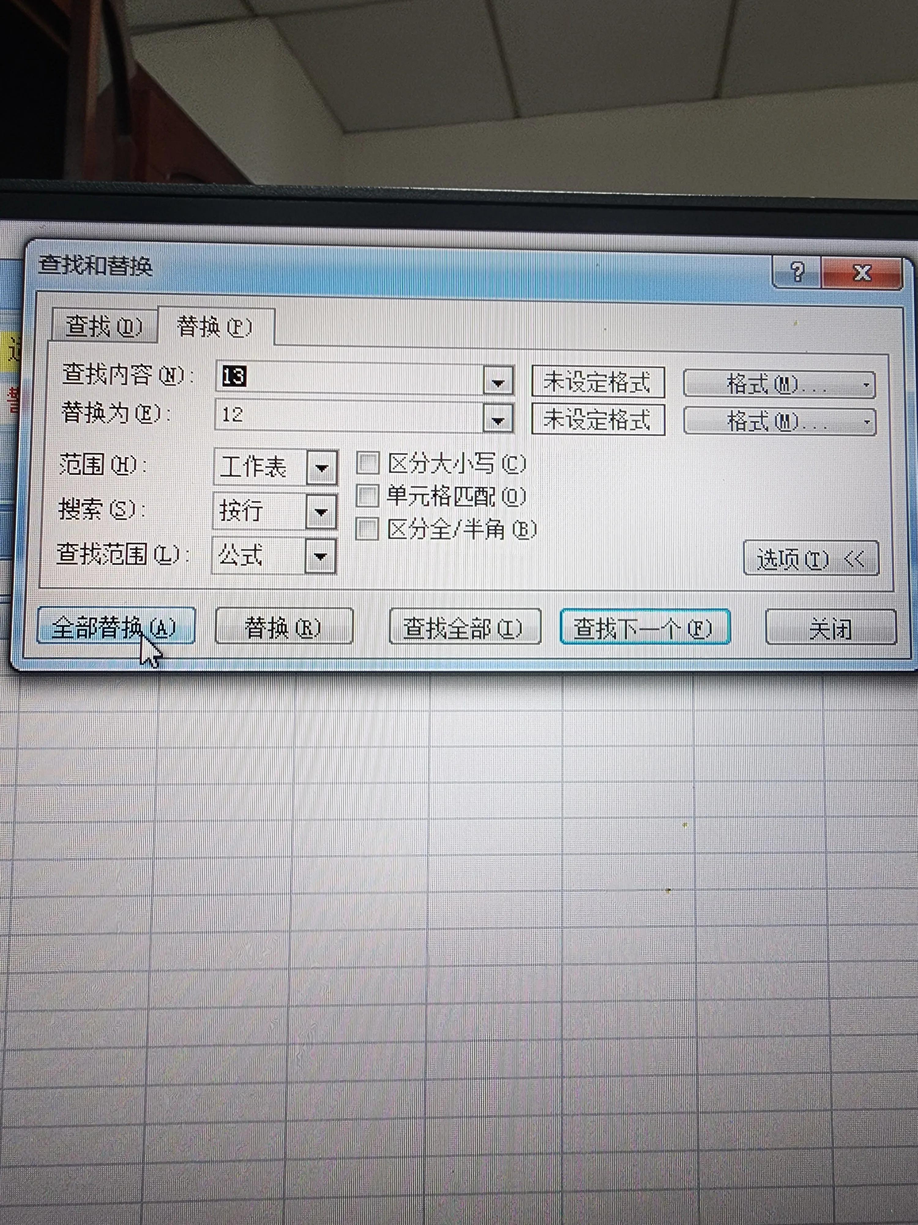 选择替换按钮,查找内容的13,替换为12,注意这里的单元格匹配关掉,有些程序是打钩的,导致下一步无法操作,点全部替换