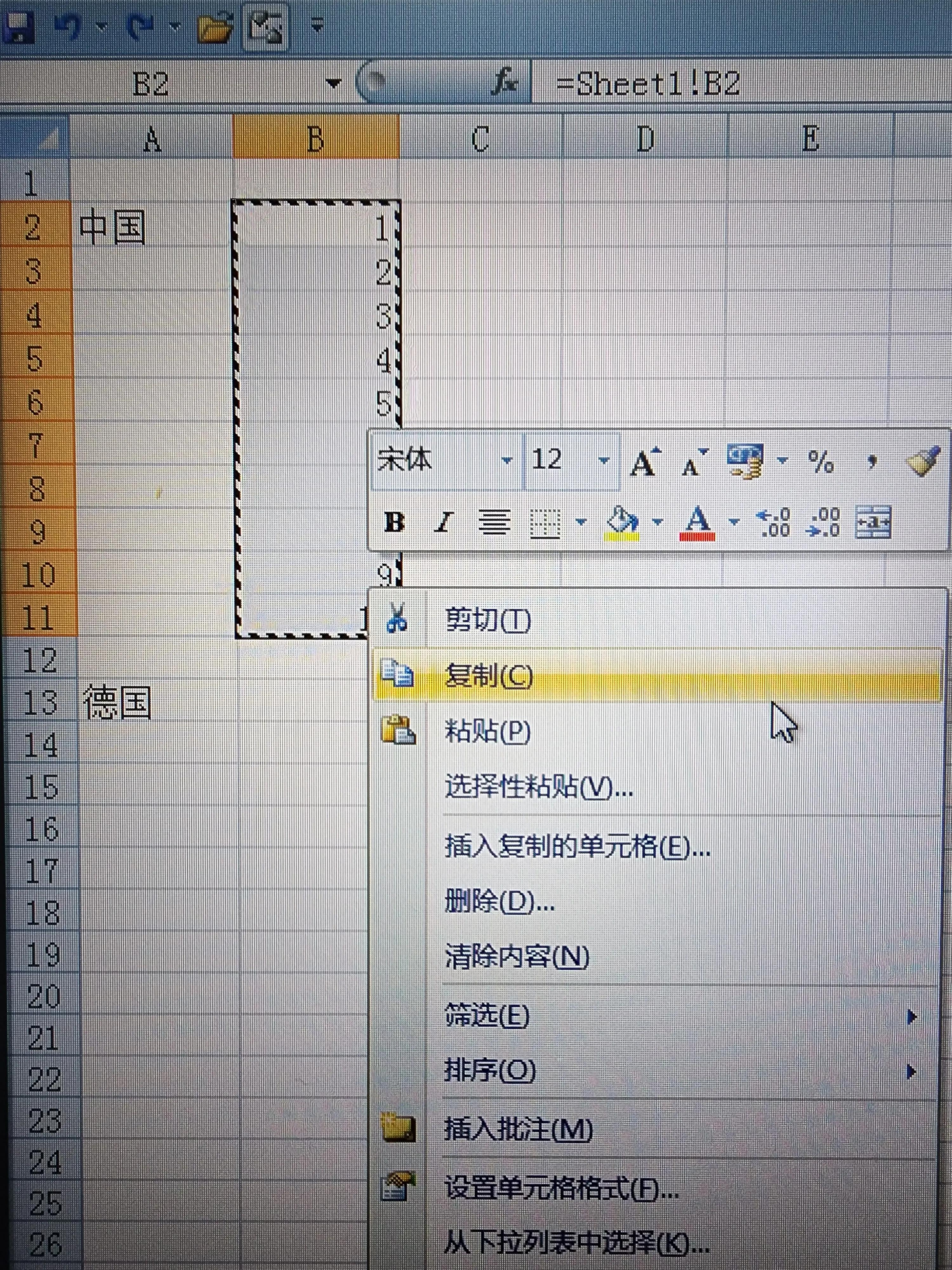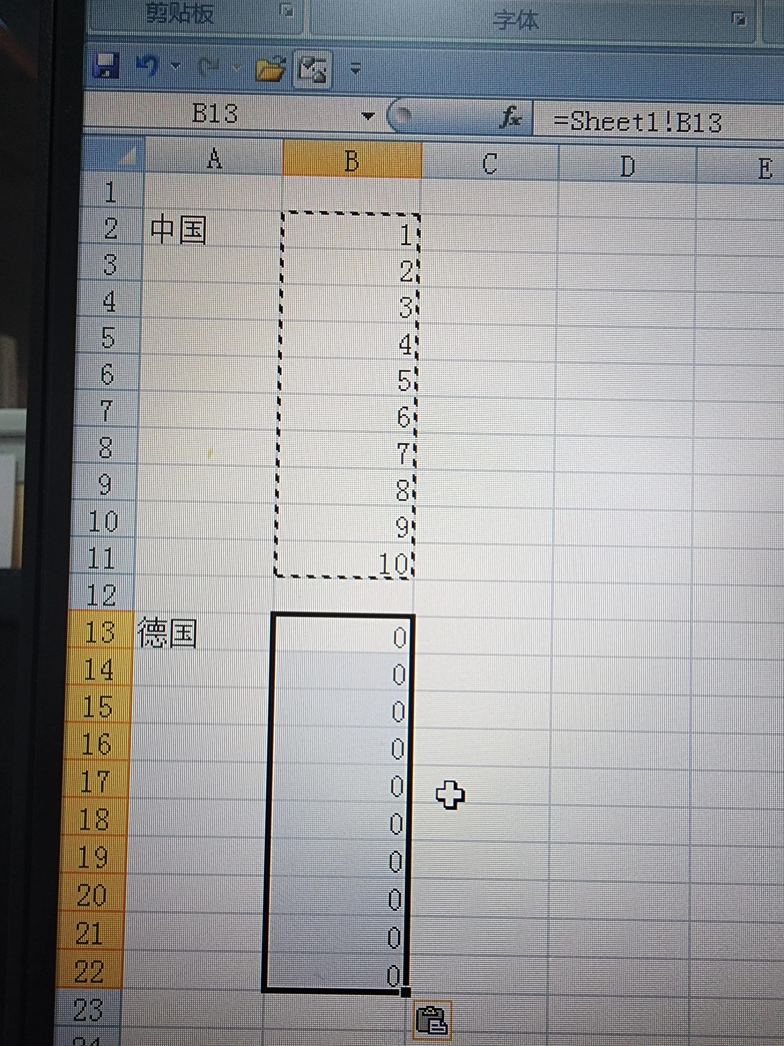 选择中国列十个数据格,复制。然后粘贴到德国列,显示如下。