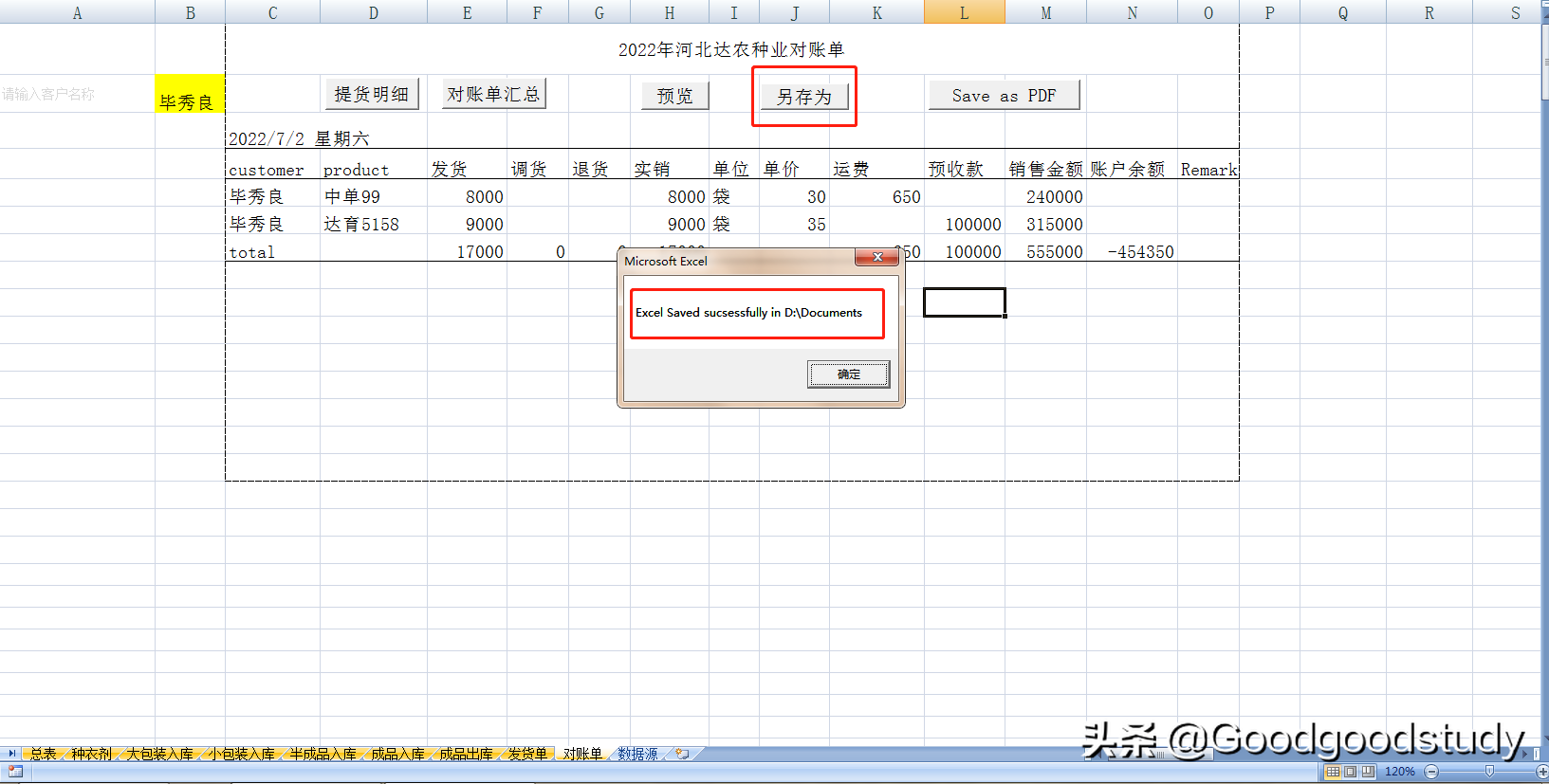 为了便于大家阅读代码的关键部分用空行进行了分割,并且必要的时候在下面用注释对代码进行了说明。请对照成品出库表和对账单工作表阅读,只要会Excel就一定能够读懂它。