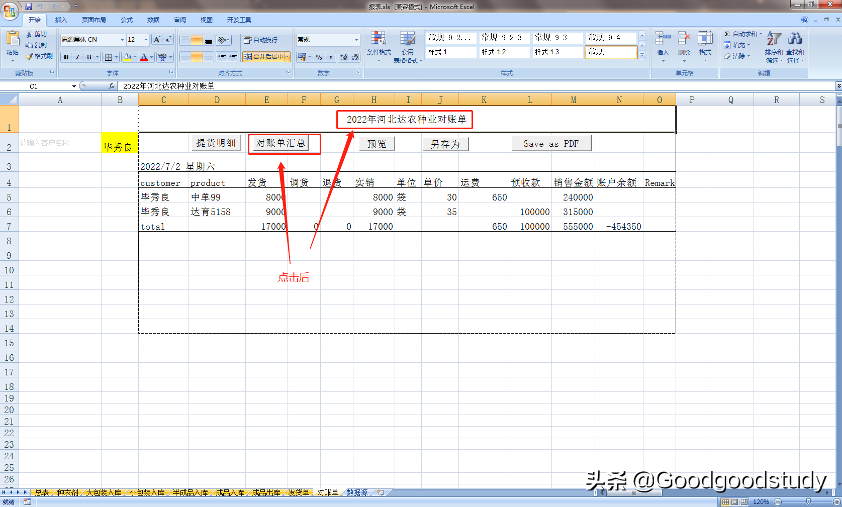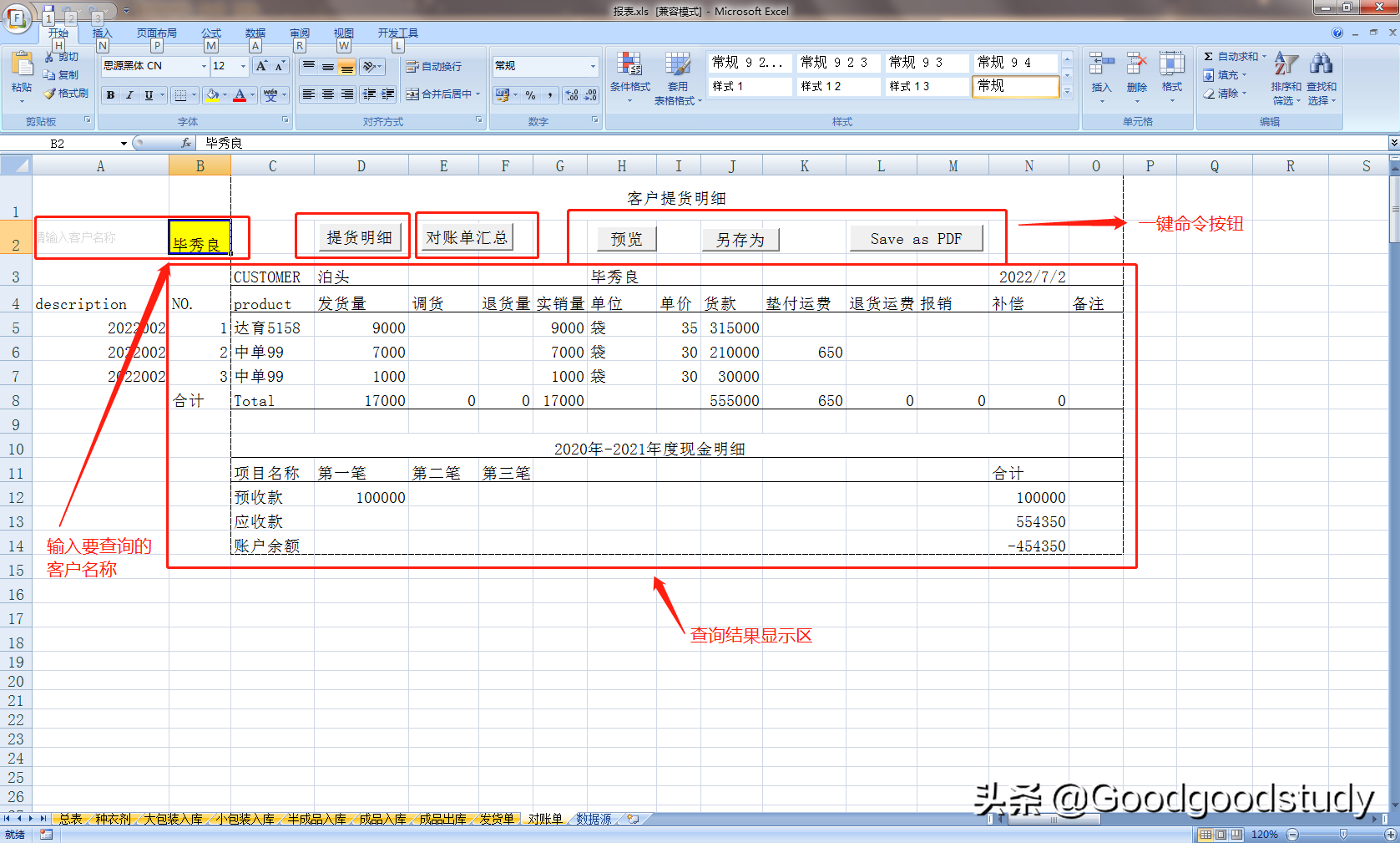 在B2单元格输入要查询的客户名称,回车,即可一键查询发货明细(这里使用了worksheet的change事件,只要B2单元格发生变化,即执行发货明细查询代码,当然也可设置对账单查询代码)。点击对账单汇总按钮即可一键查询客户对账单情况,如下图: