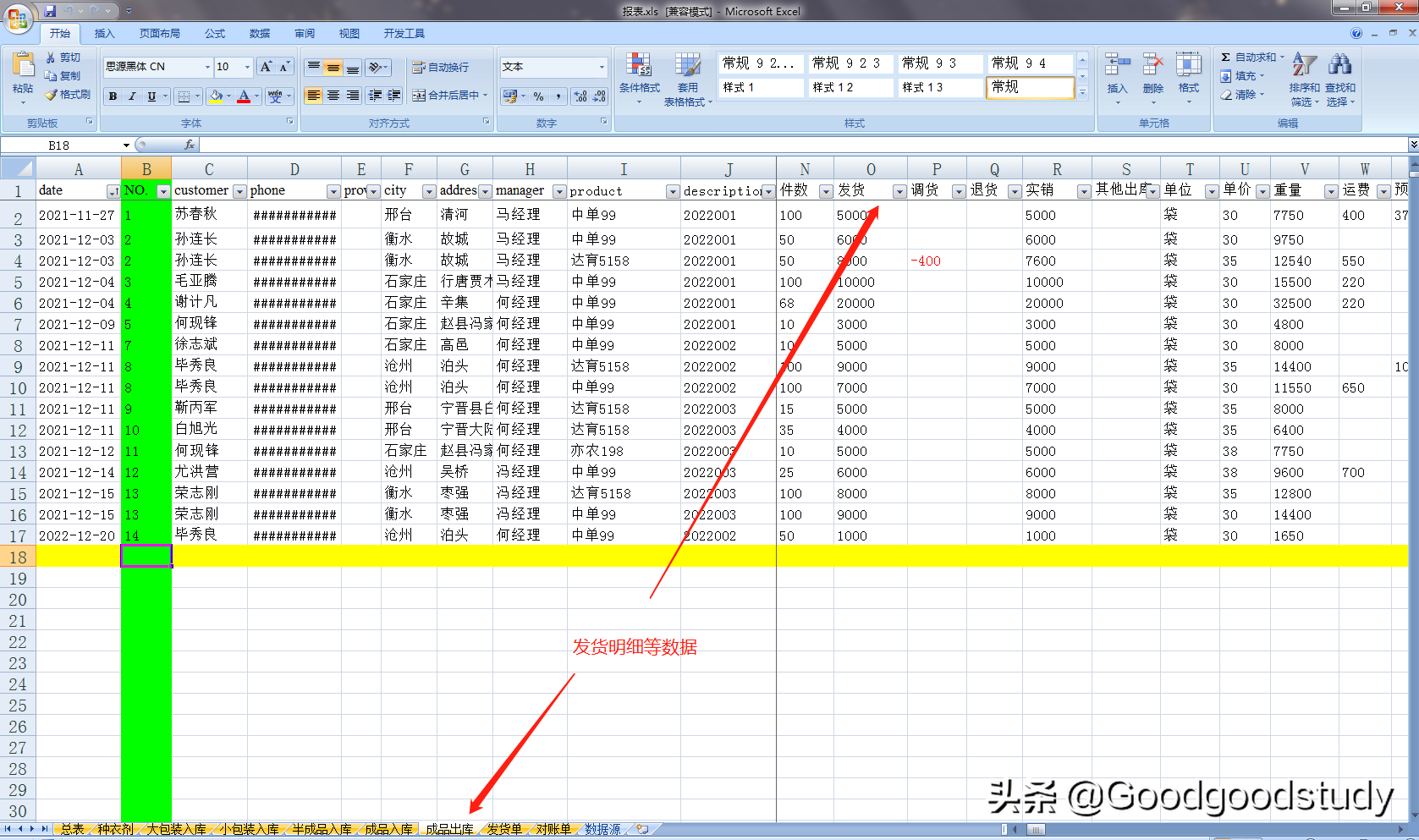 在成品出库工作表中记录了客户提货明细等数据,如下图。