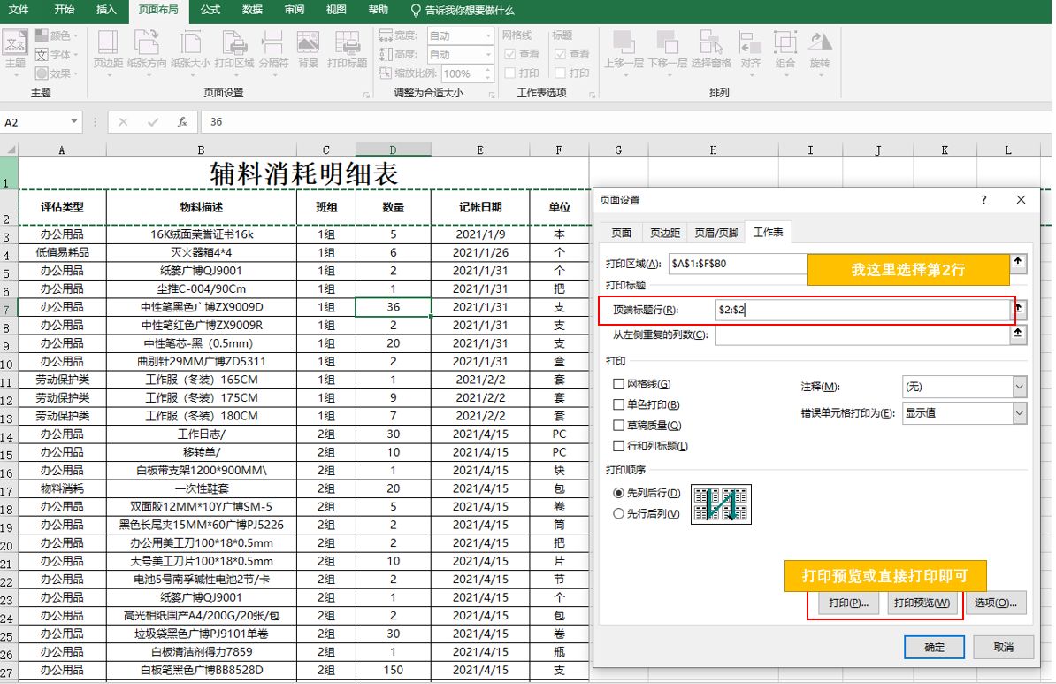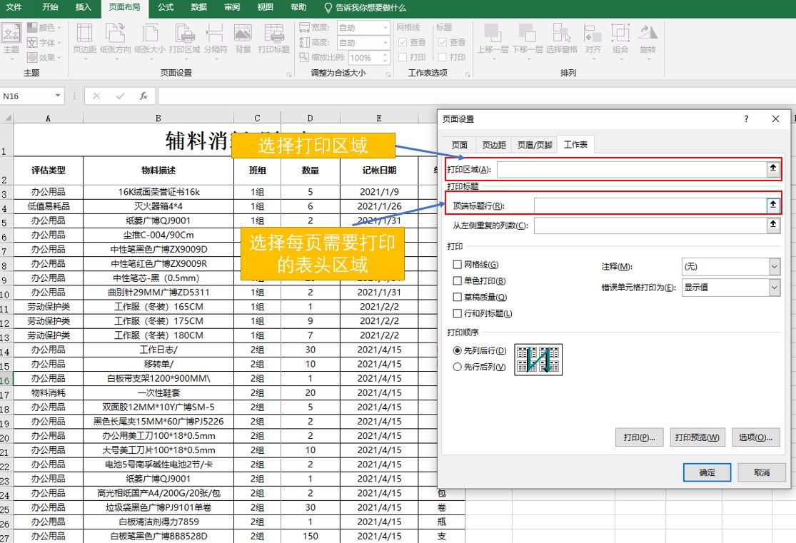 步骤2:在弹出的“页面设置”属性框,分别选择要打印的区域和每页表头需要的区域,见图2