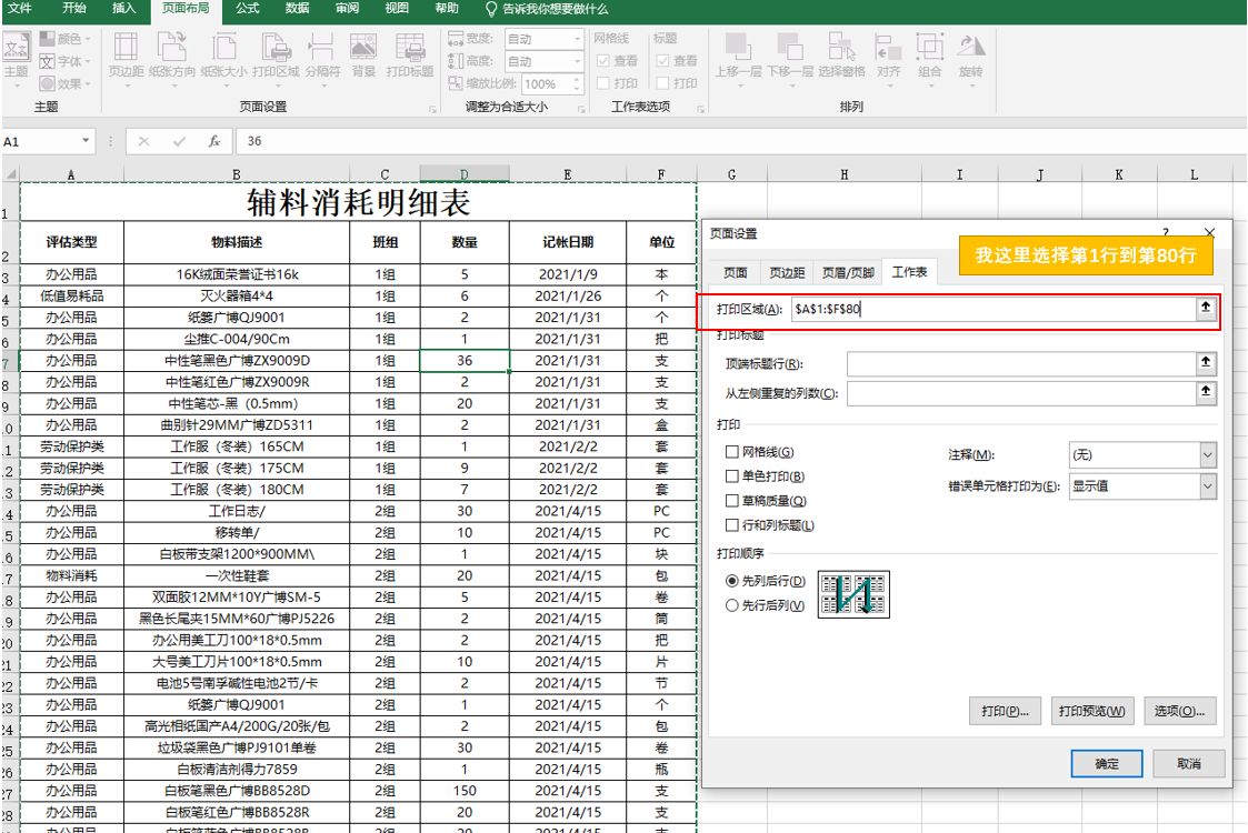 我这选择第一行道第八十行设置为打印区域,见图3,