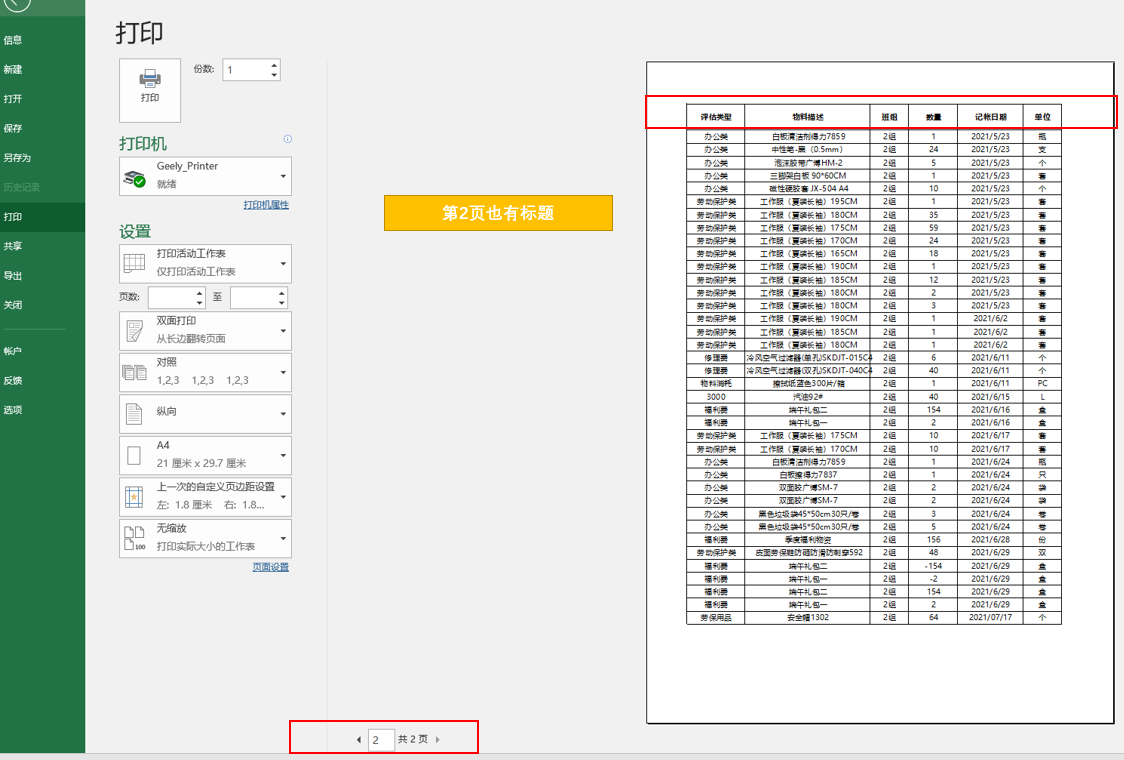 步骤5:我们单击页码看打印效果,第一页和第二页每页表头都有之前设置的第2行,见图5,图6