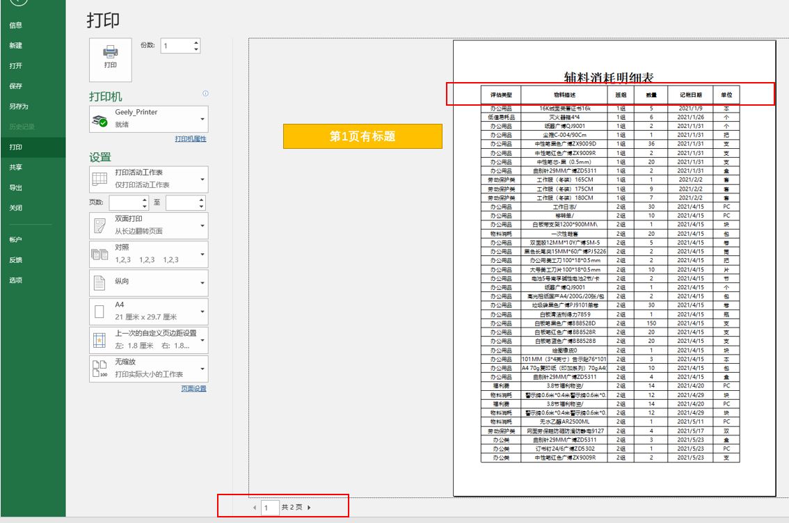设置没有问题我们单击打印就行,这样我们打印的数据就是每页都有表头内容的 。通过以上简单的几个步骤,我们就完成设置打印标题。