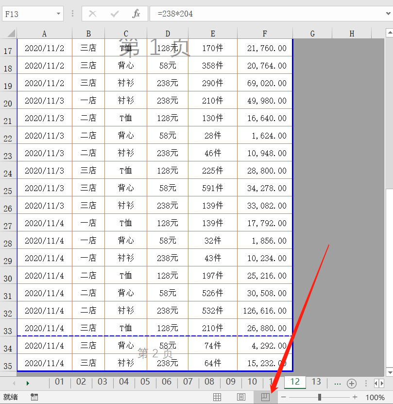 点击状态栏中的【分页预览】按钮,我们的工作表进入分页预览模式,如下图,蓝色实线是页面的连线,蓝色虚线就是表格的分页位置,移动鼠标到蓝色虚线上,鼠标变成上下箭头形状,这时按住鼠标左键不放,向下拖动到实线位置,释放鼠标按钮,表格就调整到一页纸上打印了。