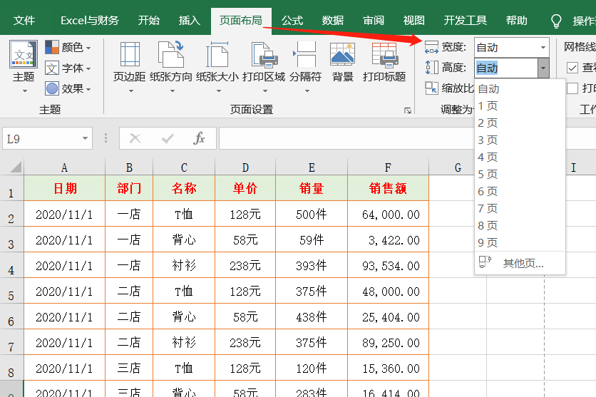切换到【页面布局】选项卡,有一个【调整为合适大小】功能组,宽度和高度都可能都点击右侧组合框选择。
