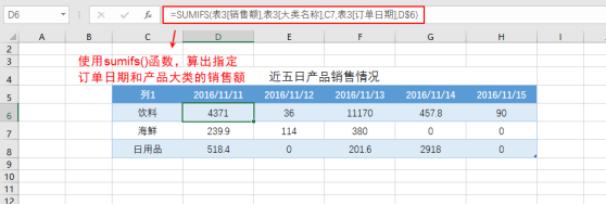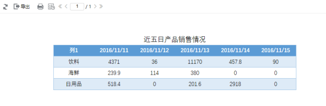 如下图:从左侧表中获取大类名称为饮料、海鲜、日用品,从2016/11/11到2016/11/15的销售额数据,这些数据是从数据库中取出来来的,要求在如图右侧以行列固定的报表展现。