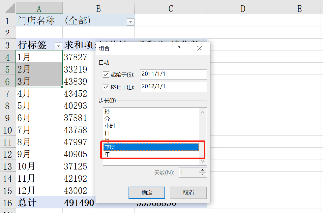 当我们将字段拖入到行时,Excel数据透视表会默认自动分组,比如这里要数据透视2011年每个门店的每月的订单量和销售额,将订单日期拖入到行会自动按照月/季度/年分组。