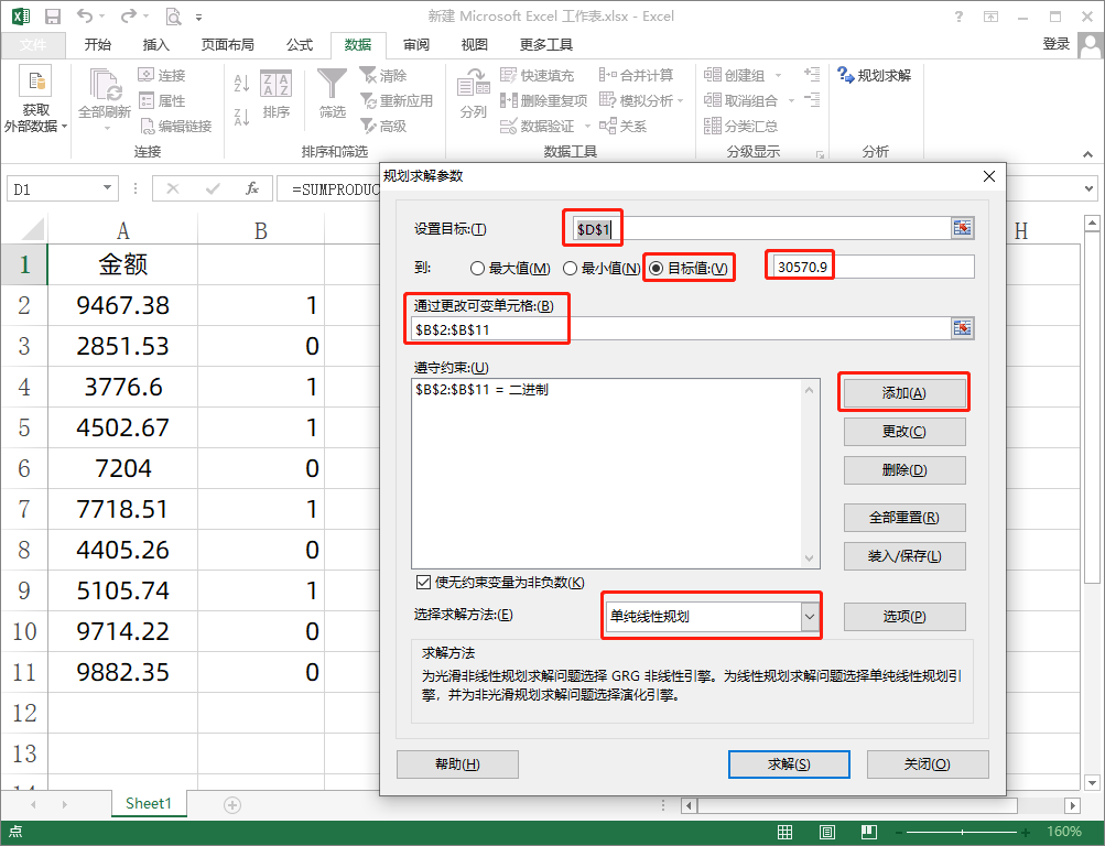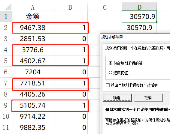 使用单纯线性规划,运行一下,就得到了我们想要的结果,数字1对应的结果就是我们这些金额凑起来正好是30570.9的结果