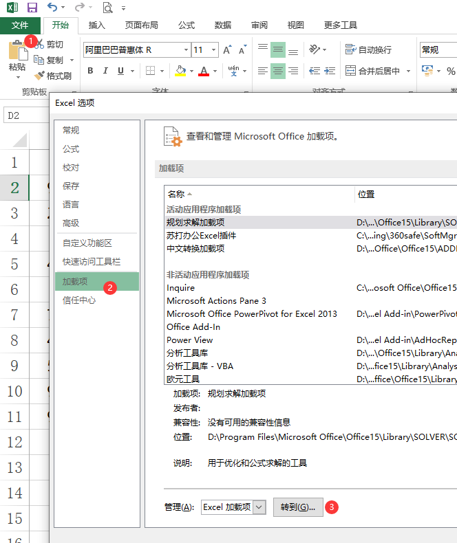 首先我们在文件,Excel选项里面,找到加载项,然后在右下角点击"转到"