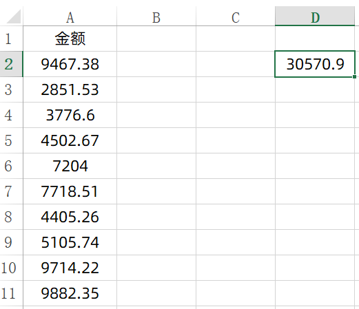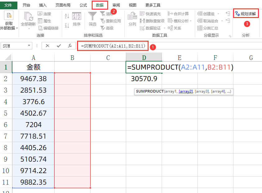 举个财务工作中经常会出现的例子,如下所示,是我们开出发票的金额,然后今天收到了一笔款项,总金额是30570.9,我们现在要找出来,是由哪几笔组成的。